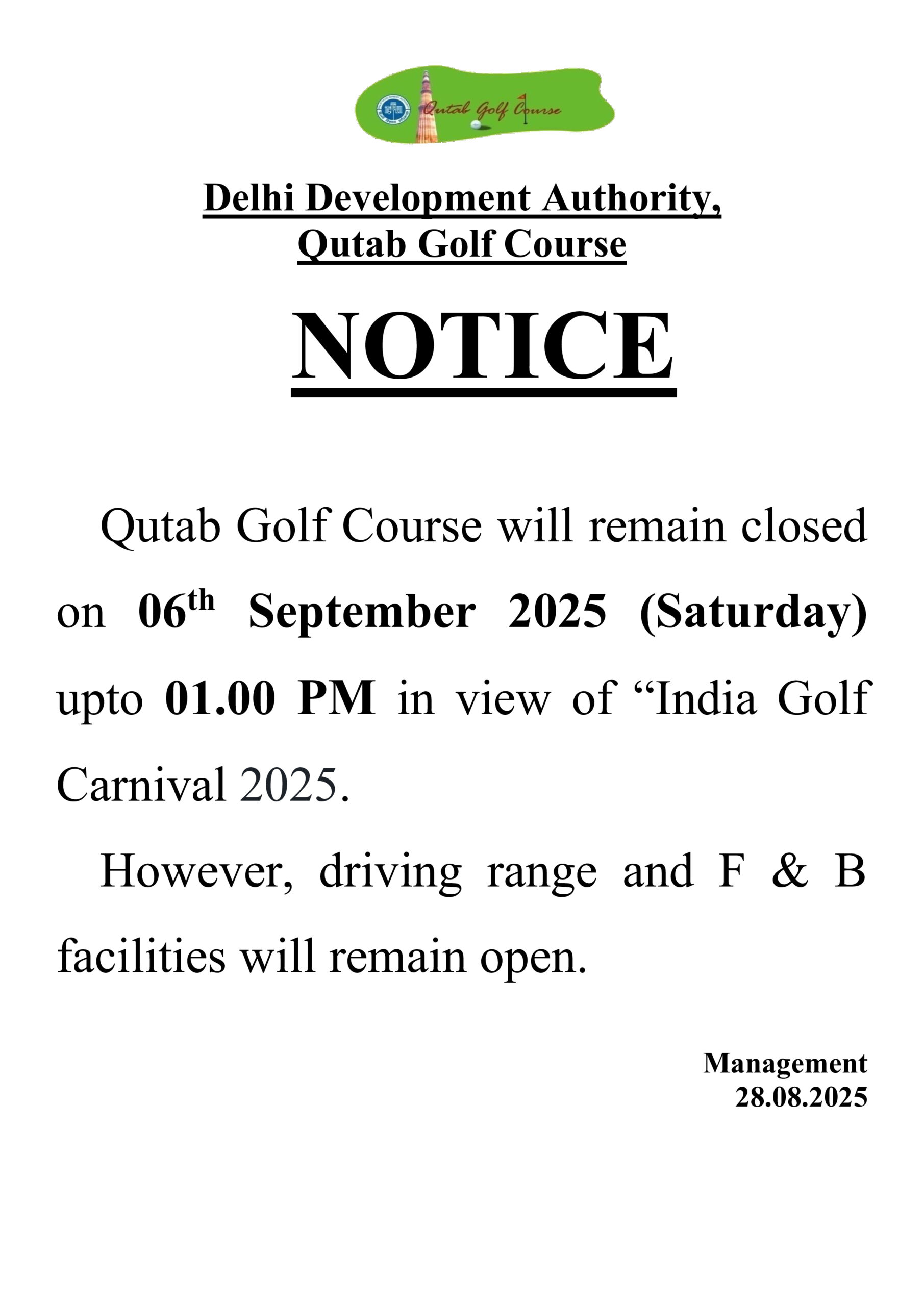 All golfers are hereby informed that from 1st March 2025 to 30th November 2025, the timings for the Driving Range and Gym at Qutab Golf Course will be as follows: