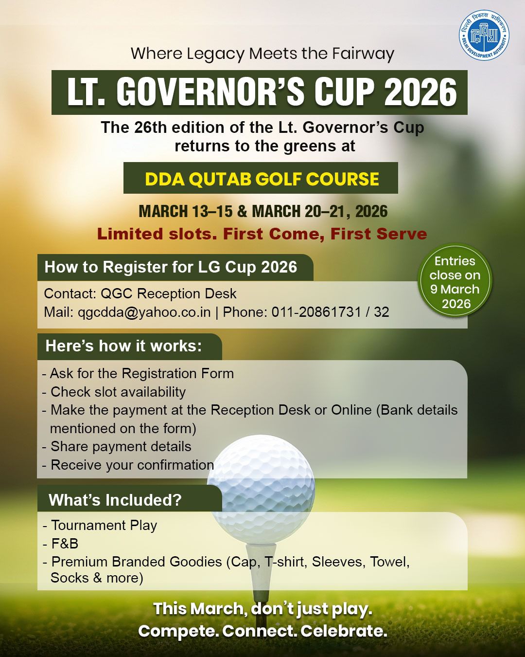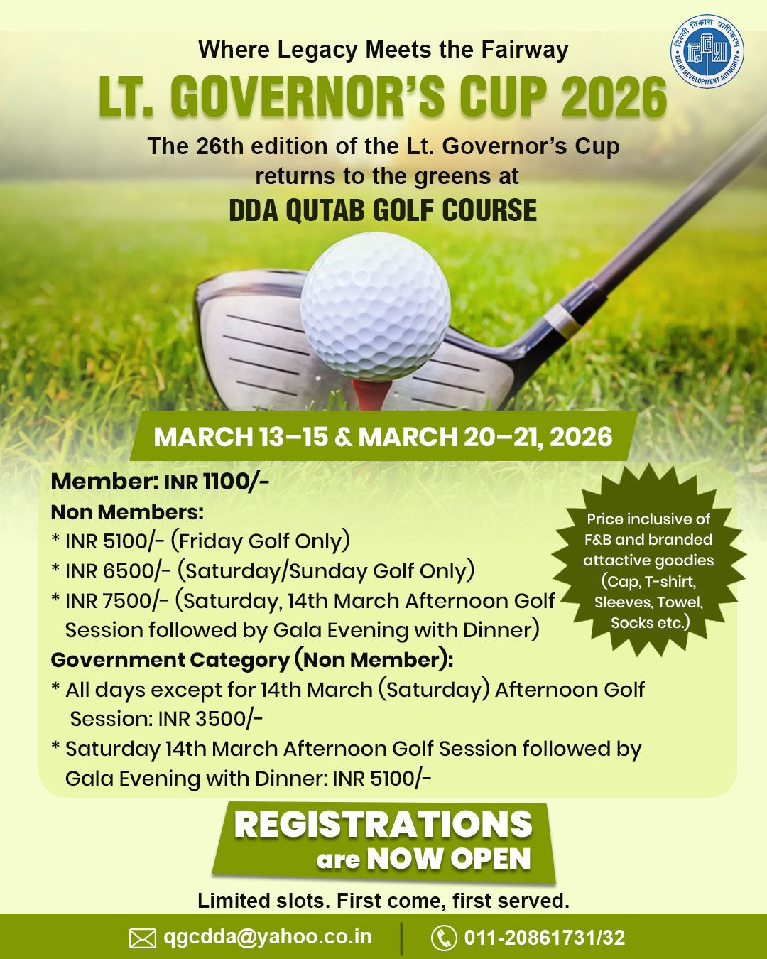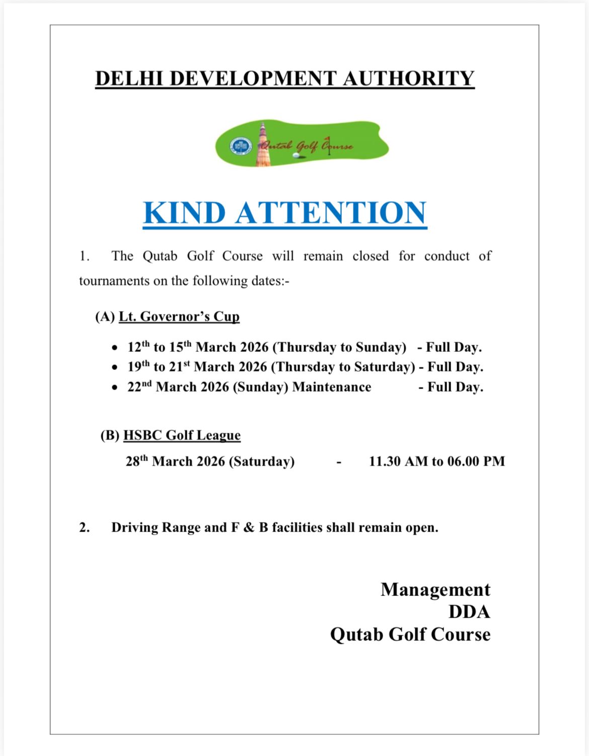 All golfers are hereby intimated that w.e.f 01st December 2025 to 28th February 2026, the timings of Driving Range and Gym of Qutab Golf Course will be as under:–